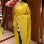 Inner Contrast: The saree features a dramatic, contrasting deep Charcoal Grey/Black lining along the fall or inner edge, which provides structural weight and makes the lime yellow pop.