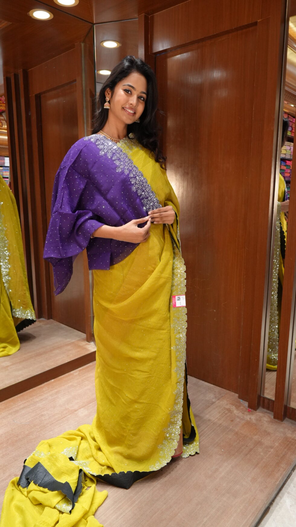 Scalloped Border: The hallmark of this design is the magnificent border along the edges and pallu, featuring a beautiful scalloped cut heavily embellished with sparkling silver sequins, crystal beads, or cut-dana work.