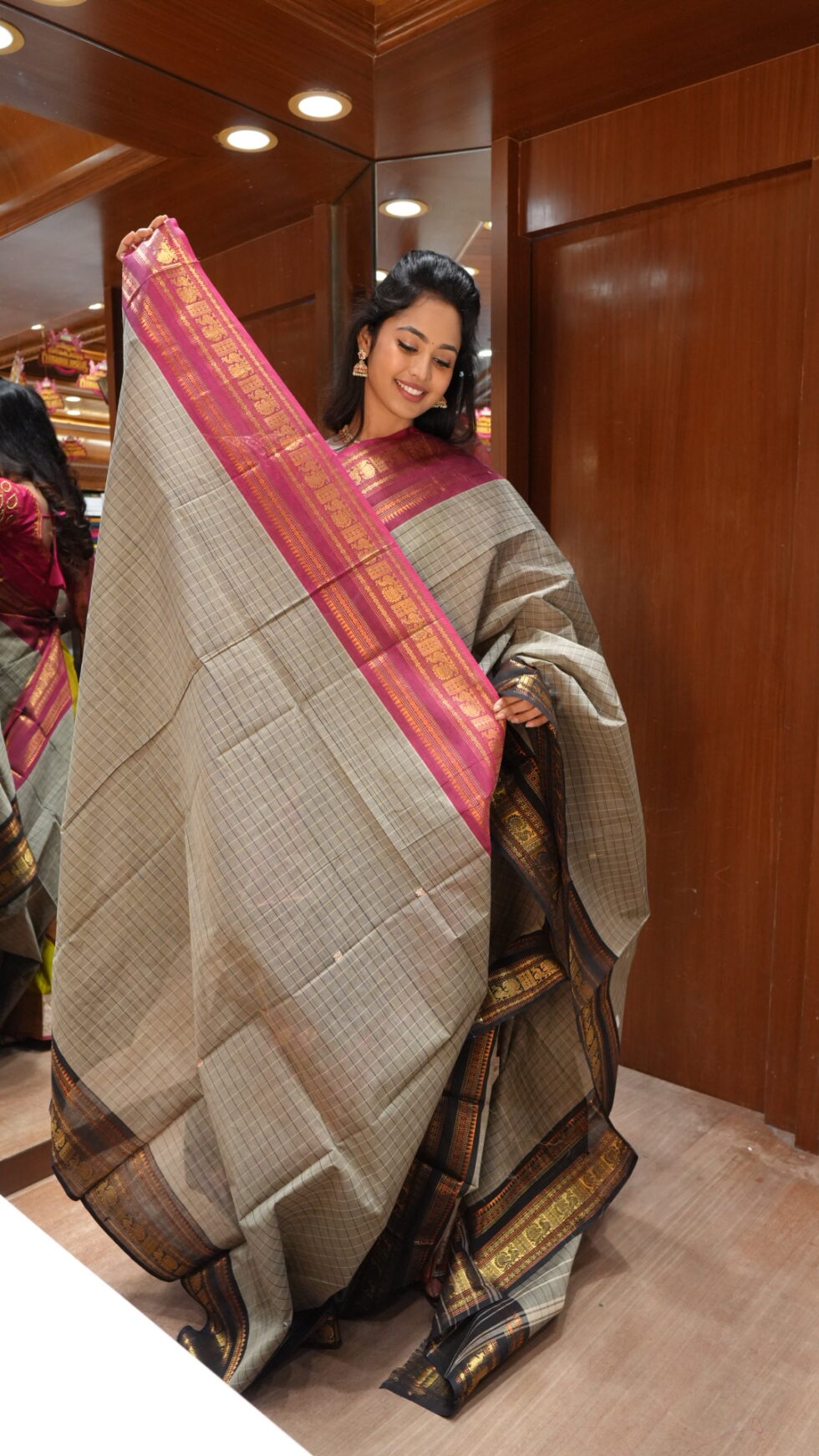 Discover the timeless elegance of this authentic Chettinad Cotton saree. The body features a sophisticated Ash Grey shade adorned with classic checks and delicate woven buttas (dots).
