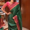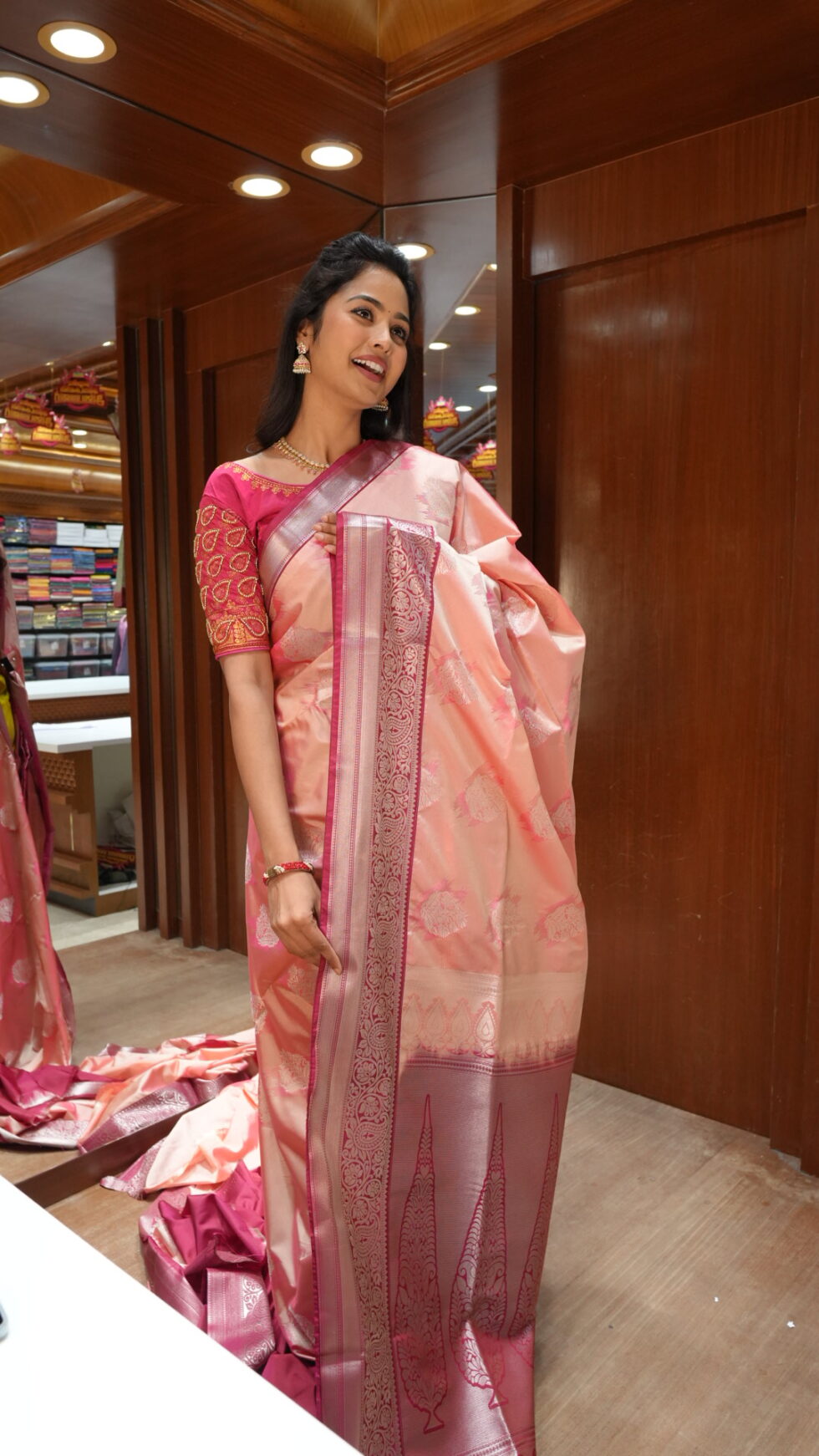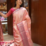 The softness of the pink is beautifully contrasted by a rich, deep Wine (Magenta) border and pallu. The pallu is a work of art, featuring grand silver zari weaving with traditional paisley and geometric patterns. Lightweight and lustrous, this saree is an impeccable choice for day weddings, receptions, and festive gatherings.