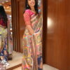 Style Tipe : Worn with a vibrant Rani Pink blouse featuring detailed gold or red thread embroidery on the sleeves, offering a beautiful color balance to the multi-hued prints.